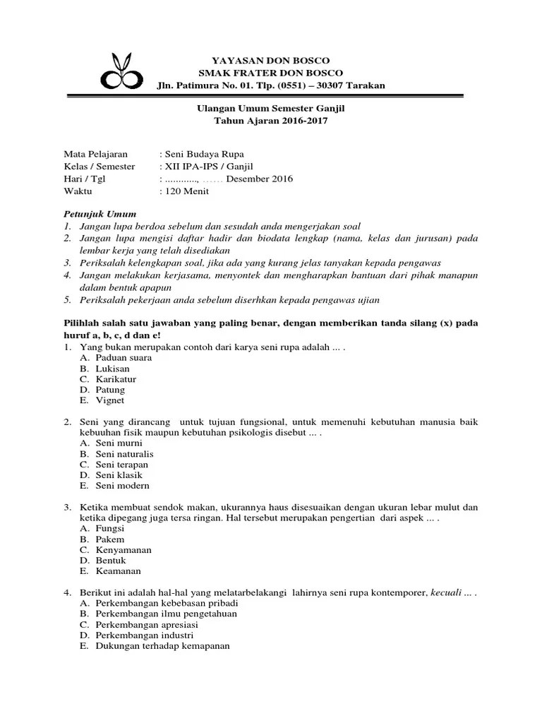 2021 08 soal dan kunci jawaban uas seni budaya.html2020 06 soal pasuas seni budaya kelas 7 smpmts14.htmlsoal seni budaya kelas 12 alat untuk meletakkan cat . Pada kesempatan kali ini kherysuryawan.id . Berikut di bawah ini soal sbk kurtilas edisi lengkap dengan kunci jawabannya. 35 contoh soal uas/pas seni budaya kelas 12 semester 1 kurikulum 2013 edisi revisi beserta jawaban lengkap part2 untuk siswa sma/ma/smk/mak . Berilah tanda silang (x) pada huruf a, b, c, d, atau e di depan .